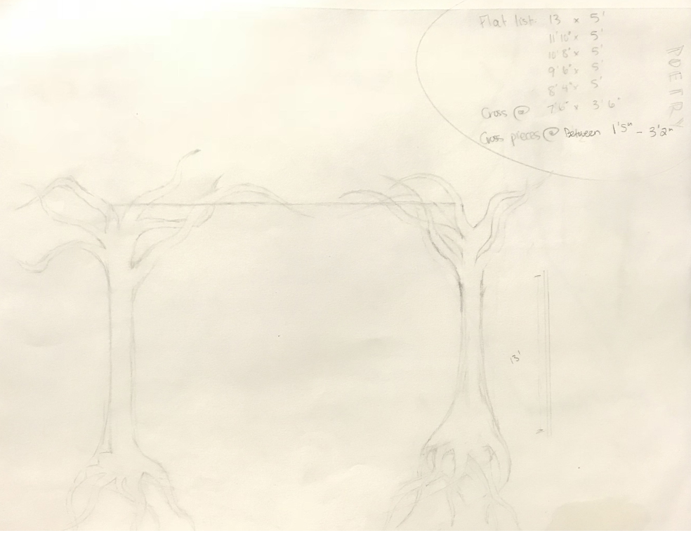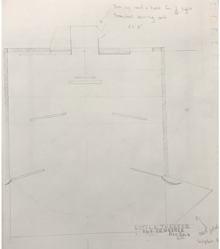The Crucible Drafts I am currently working on scenic designing The Crucible for PTG. Featured here is a template for the theatre space, the Little Theatre, along with a draft of a floor plan. The last image is a sketch of trees to frame the stage. Both the director and I are fascinated by the play's woods and wanted to incorporate it into the production. I am currently planning on creating beech-like trees, with collaged drawings from the 1600s and newspaper clippings from the age of McCarthyism and from today. | |