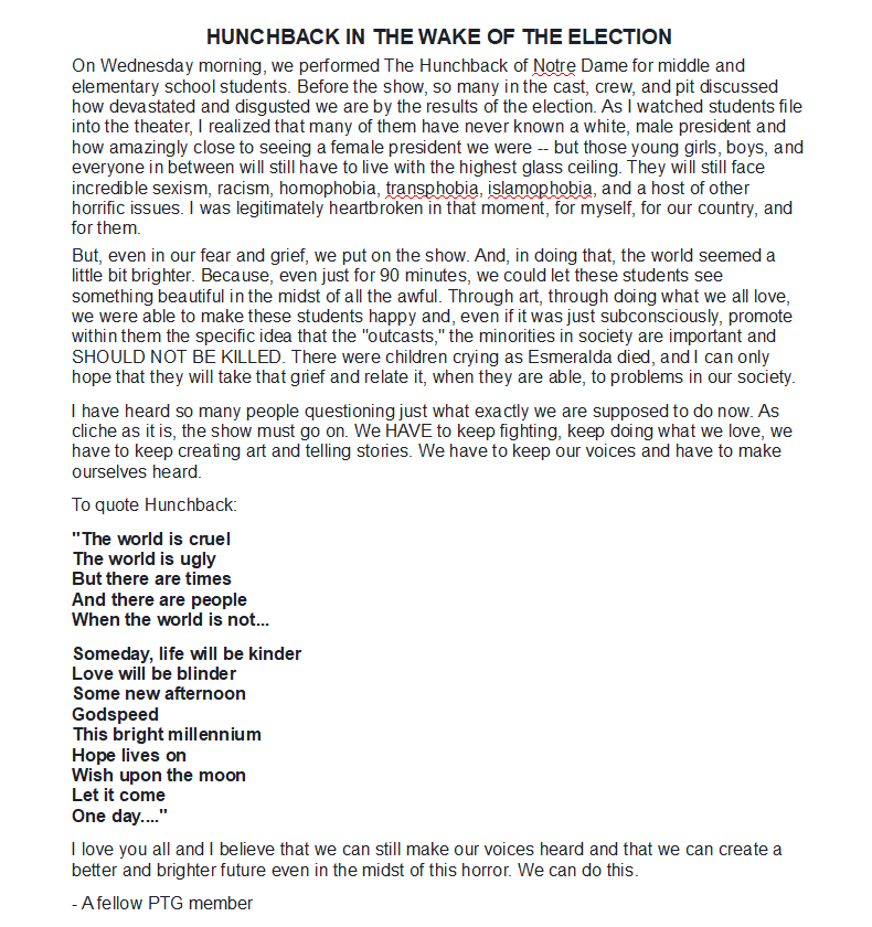 Hunchback and 2016 PTG performed Hunchback for elementary and middle school students the day after the 2016 election. Many Pioneer students felt shocked and horrified, and didn't know what to do with themselves. I wrote this piece to try to alleviate some of the pain and posted it around the theater. | |