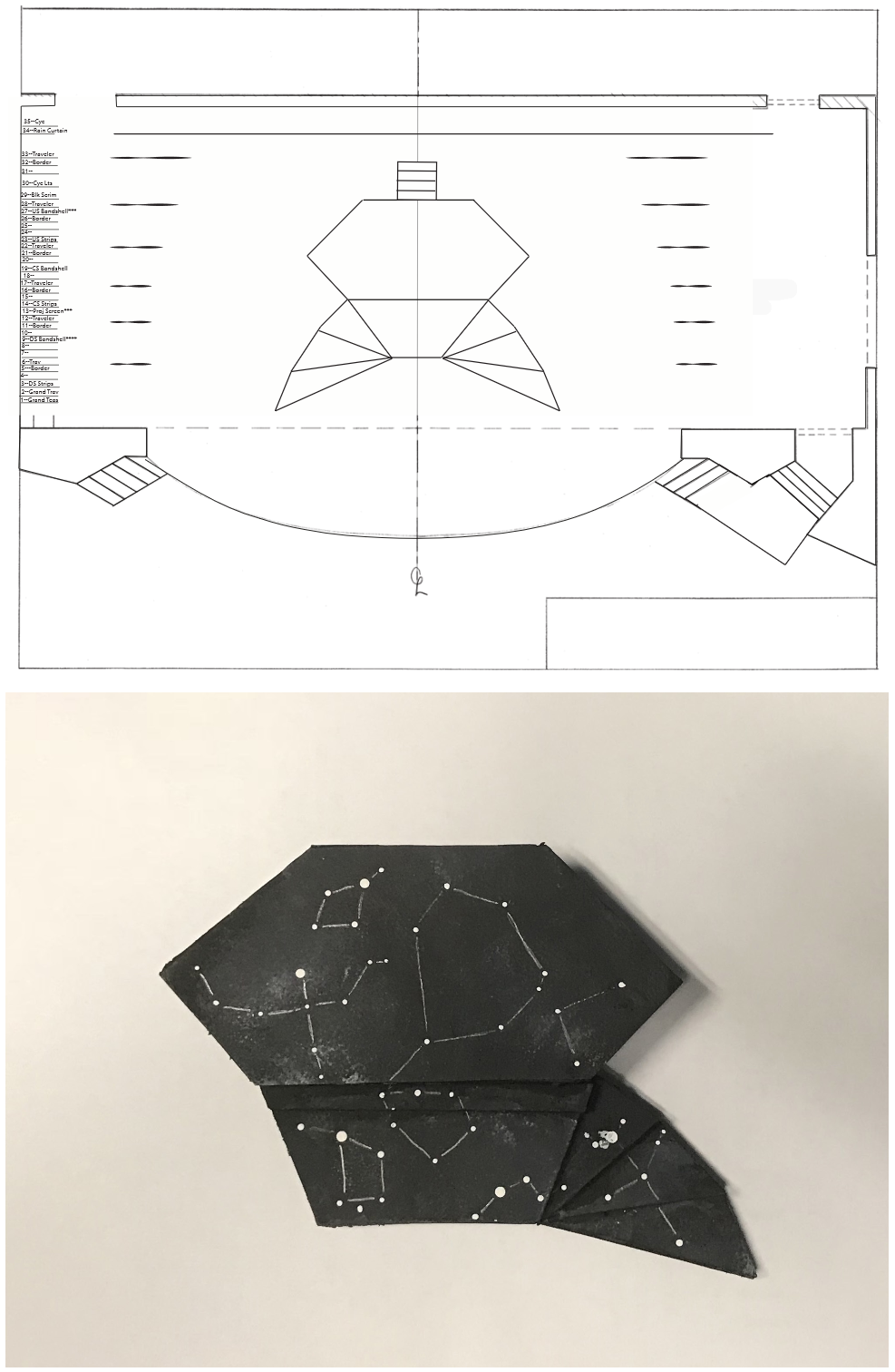 FutureStars: 2017 Groundplan and Model In designing platforming, I had to use parts left over from Hunchback, simply because we had little time to build more, but was able to add and move to fit the shape I wanted. The model pictured is missing part of the stairs (as they were lost to the depths of my technical director's office), but shows the galaxy-themed painting. | |