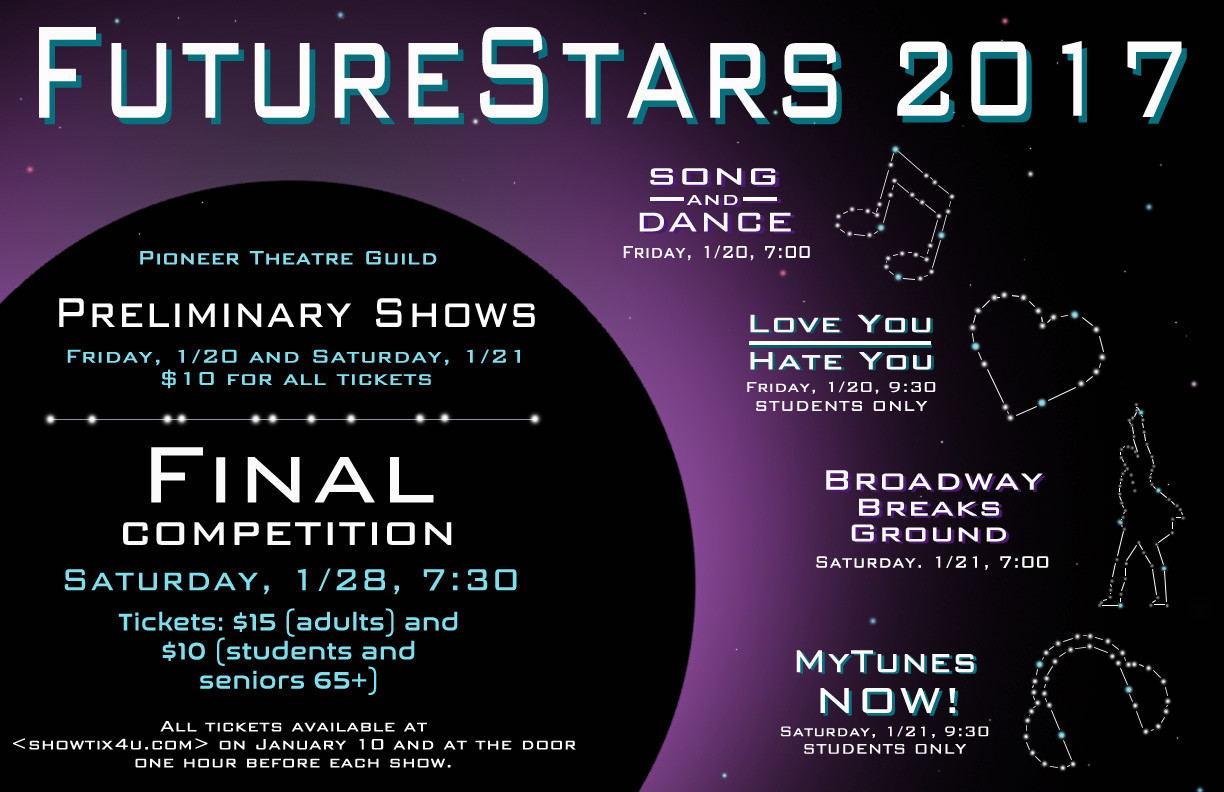 FutureStars 2017 Poster FutureStars, a Pioneer-based talent competition, has long been dominated design-wise by five pointed stars and cityscapes. As a child raised with "Star Trek" and songs about Apollo 13, I wanted to take it in a different direction: toward actual stars. Throughout the poster & scenic design I incorporated constellations and space-related elements to play off the title of the competition. | |