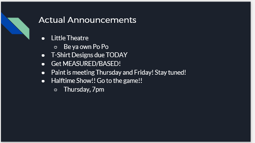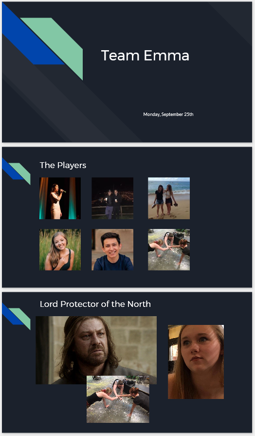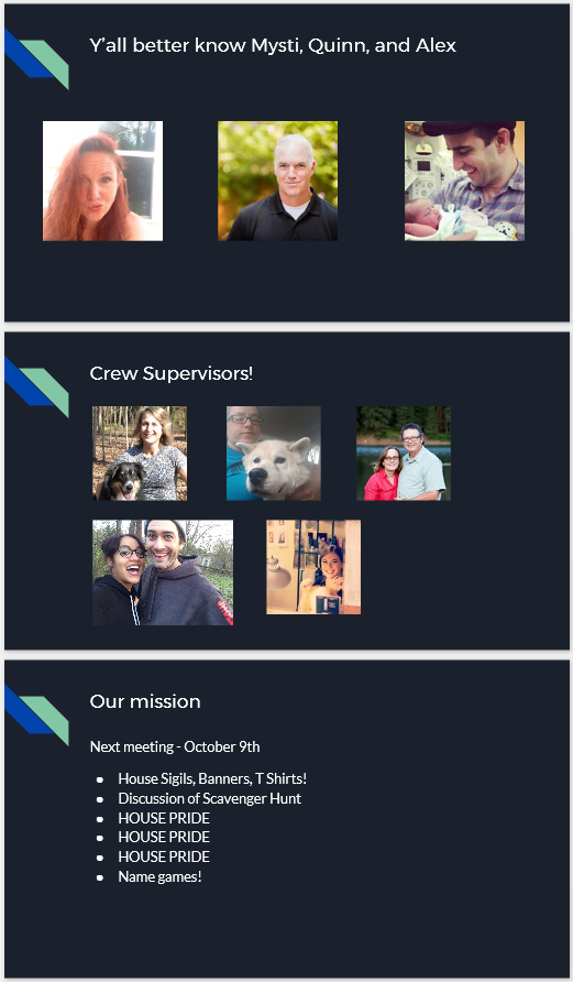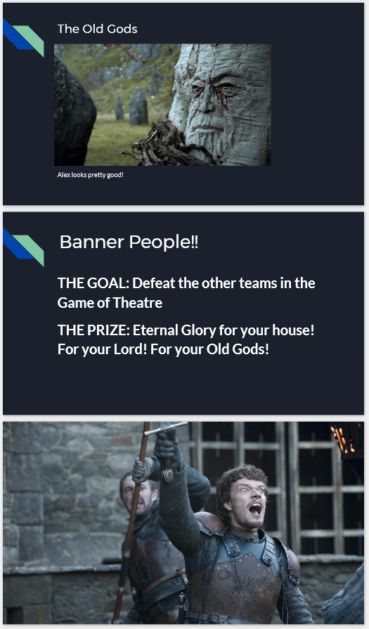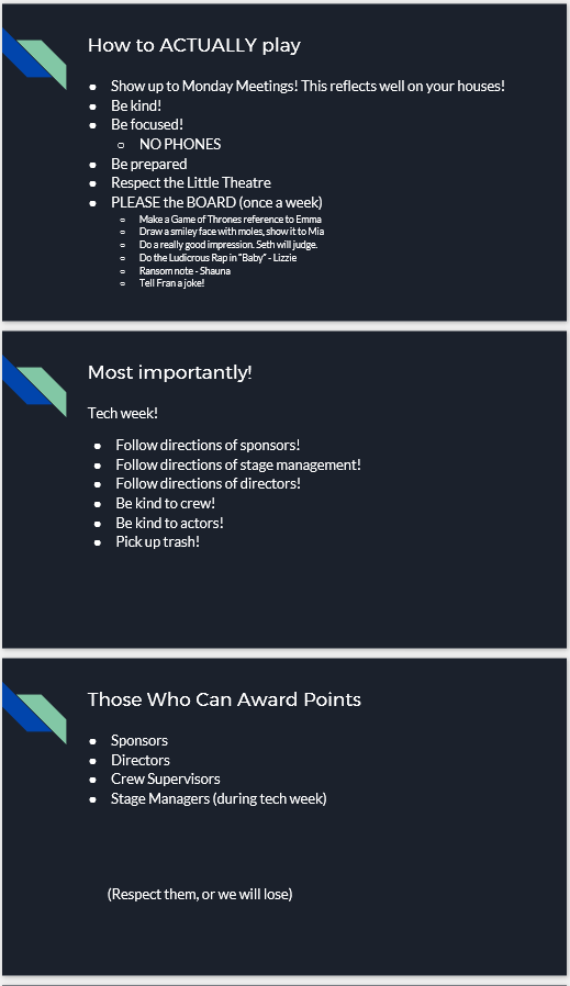 PTG Houses Pioneer Theatre Guild has long had a problem with both actor/techie relations and underclassman vs. upperclassman cliques. To alleviate some of the tension (and partly as a result of an all-summer Game of Thrones binge) I created a PTG house system, wherein the student board members organize meetings and bonding activities for their houses. The houses are an even mixture of grades and roles in the productions and have, so far, worked to help ease tensions and create a happier atmosphere. | |