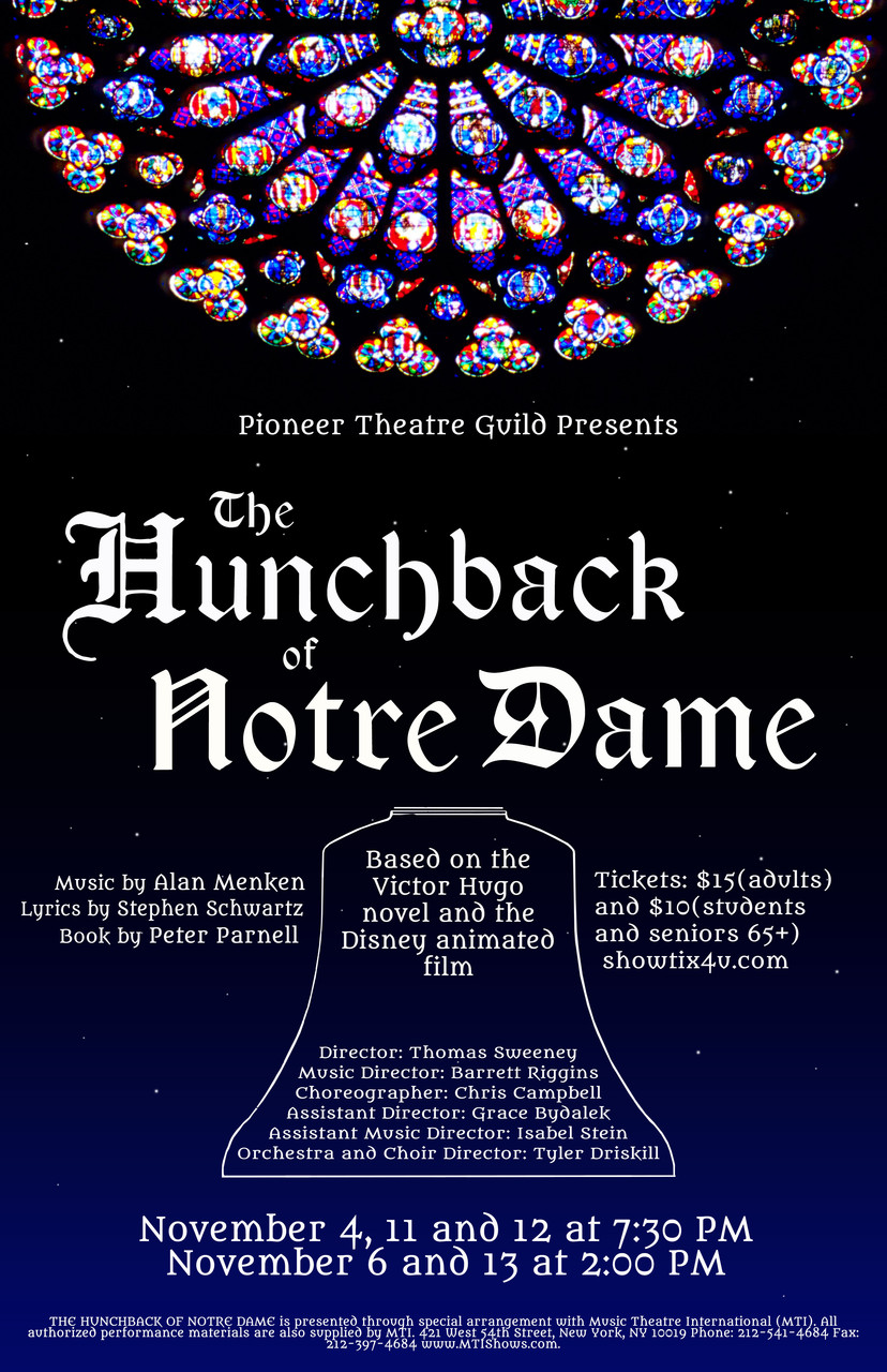 The Hunchback of Notre Dame Poster PTG's 2016 workshopped production of The Hunchback of Notre Dame was one of the first in the country on the high school level. It was directed by University of Michigan students, as are most of our shows, and I was given the opportunity to create the poster for this show. | |