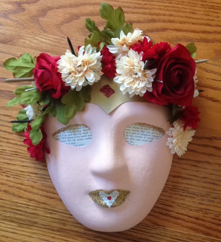 My Outside Face I've recently become obsessed with odd juxtapositions and oxymorons: I've completed personal research on historical perceptions of women as both divine and beastly; I've taken to reading in swimming pools and; I really like flowers and screws. They both remind me of theatre, but I really enjoy the harsh, thorny quality of screws combined with the softness of flowers. This specific piece is a self-portrait therapy mask. | |