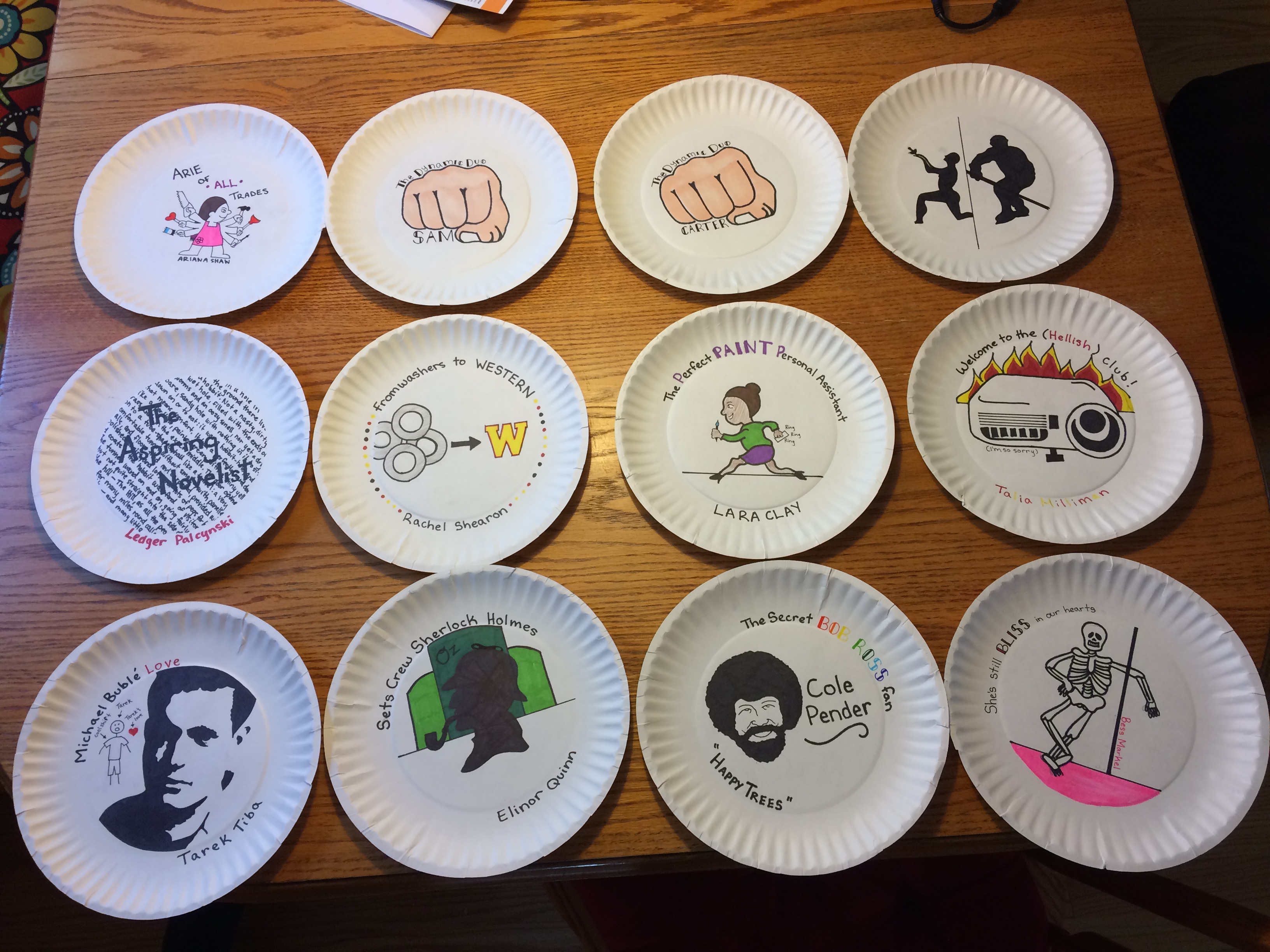 Paper Plates At the end of the school year, the PTG student board members create paper plate awards for all the cast and crew. These are a few of the paper plates I made -- my personal favorite is "The Secret Bob Ross Fan" award. | |