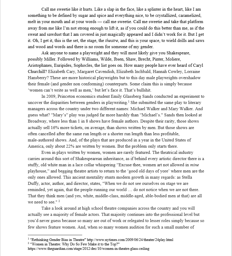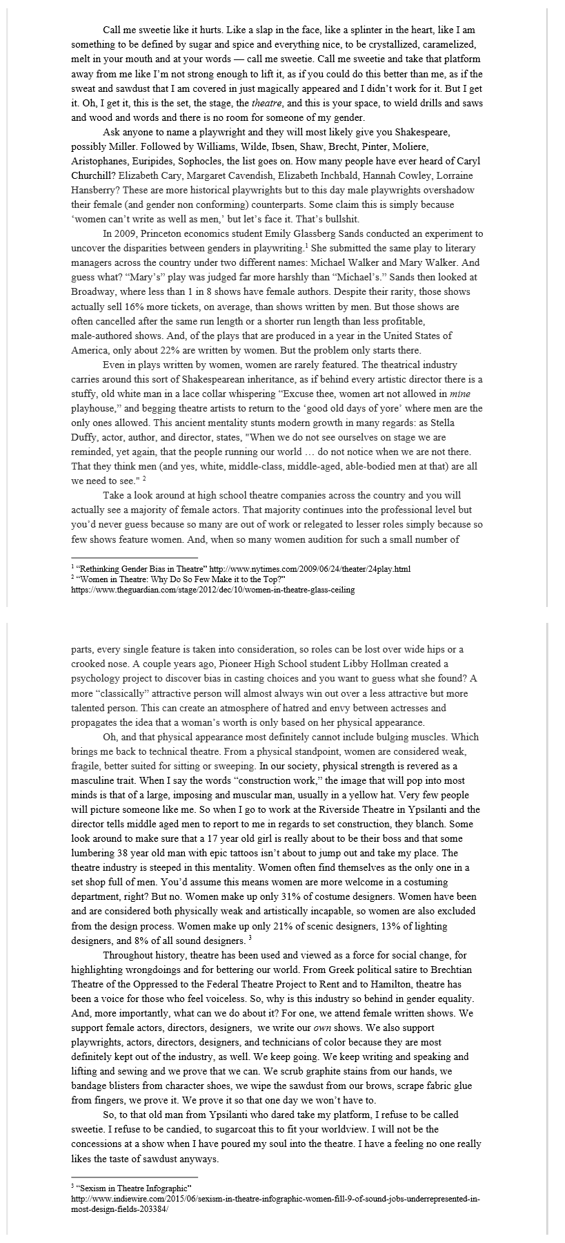 An Open Letter to the Old Man Who Called Me Sweetie - or - A Look at Women I wrote this personal essay as a "Free XP" assignment for my AP 11 English class - in essence, the assignment required that we speak as freely as we wished, on a subject of our choice, and read the piece to the class. I wrote this open letter both to vent about a recent experience in theatre, and to explore gender dynamics throughout the theatre industry as a whole. |