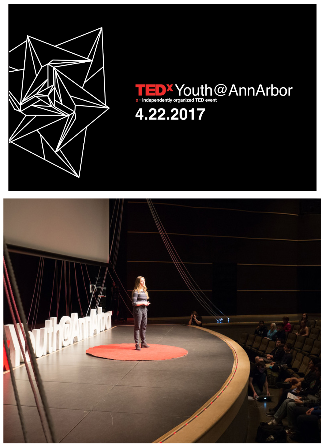 TEDx Poster and Set As the TEDx Youth Ann Arbor tech committee head, I was able to assist in poster design, design the set, and operate cameras during the talks. Featured here are the poster and a picture of the set. The theme for the year was UniTED, and my committee worked to create a sense of unity and yet individuality through string-art-like designs. | |